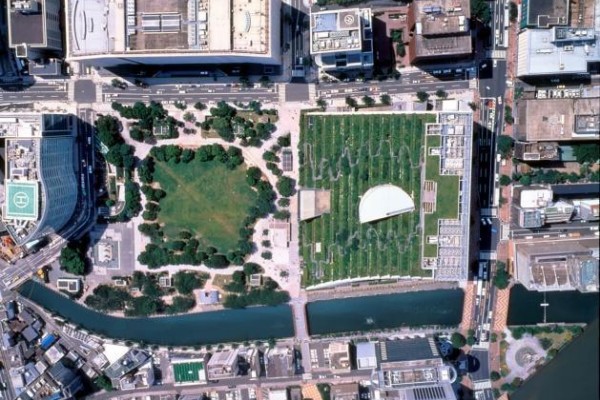 FIG. 4: ACROS Fukuoka view from the sky - The Huntington Place, United States of America: The Huntington Place, formerly known as the Cobo Centre, is an important US conference venue. In 2015, it was revitalised with a $279 million eco-friendly renovation. They added a big green roof, used materials that are good for the environment, and made sure to recycle a lot. They even reuse water and use energy-saving tech. Now, it uses WAY less energy – more than 60% less! The Huntington Place is now a great example of how old buildings can be updated to be green and modern, helping cities become stronger and better for the planet 14Aaron Mondry, “Curbed Detroit – The greenest buildings in Detroit, mapped”. 22 April 2019. https://detroit.curbed.com/maps/greenest-buildings-in-detroit-mapped 15Huntington Place, “Sustainability.” 2022. https://www.huntingtonplacedetroit.com/sustainability 16Mary Klida, “Historic Detroit – Huntington Place.” No date. https://historicdetroit.org/buildings/cobo-center.