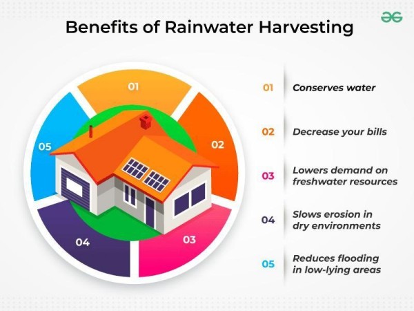 FIG. 2: Advantages of rainwater capture systems9Geeks for Geeks, “Benefits of Rainwater Harvesting”. No date. https://media.geeksforgeeks.org/wp-content/uploads/20231108120733/Benefits-of-Rainwater-Harvesting.png